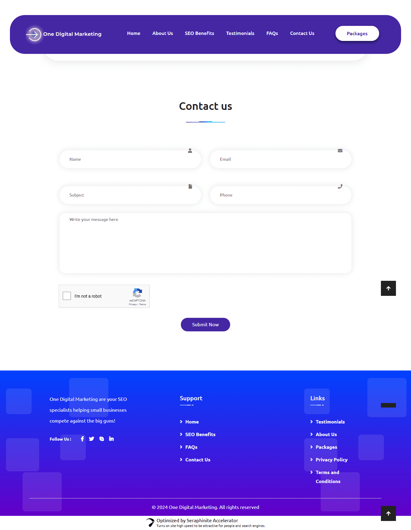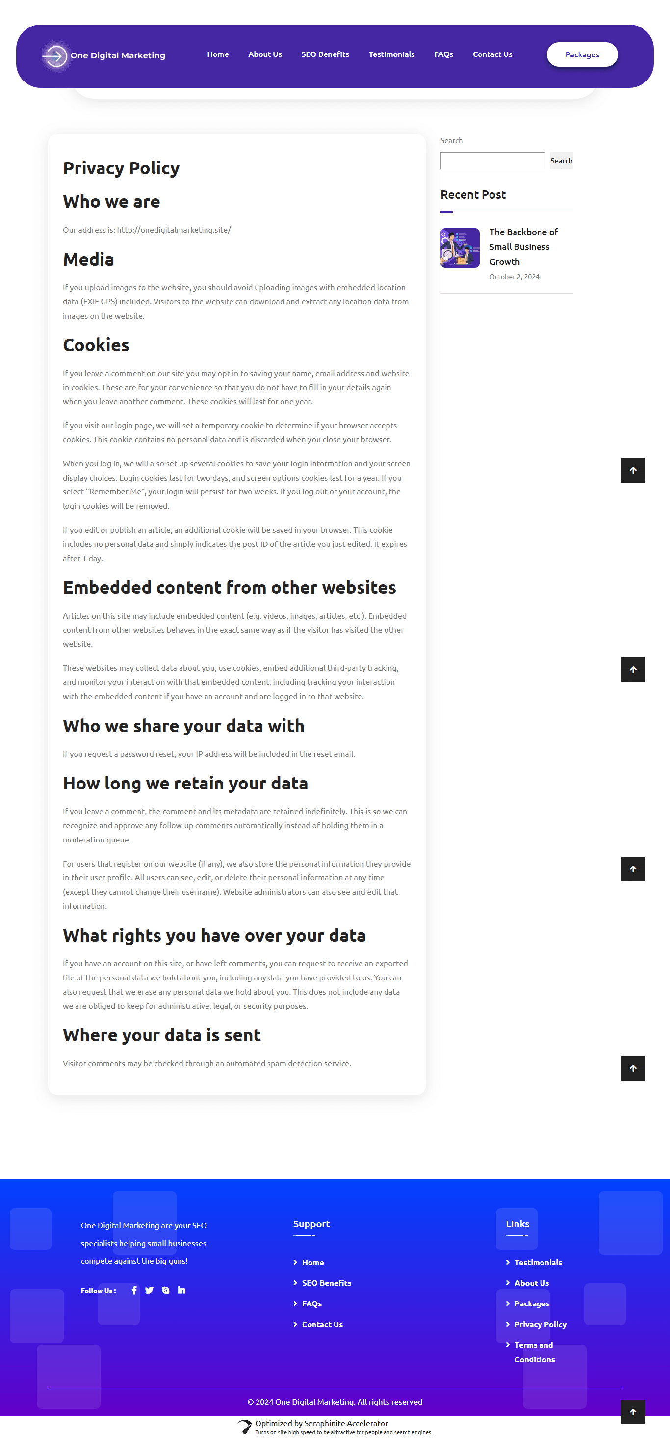 Site Architecture: Structured and designed key pages such as:Home - https://onedigitalmarketing.site/ About Us - https://onedigitalmarketing.site/#about Packages - https://onedigitalmarketing.site/#packages Contact - https://onedigitalmarketing.site/contact/ FAQ - https://onedigitalmarketing.site/faq/ Testimonials - https://onedigitalmarketing.site/#testimonials Privacy Policy - https://onedigitalmarketing.site/privacy-policy/ Terms of Service - https://onedigitalmarketing.site/terms-and-conditions/